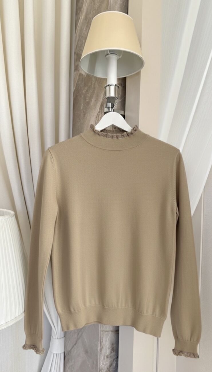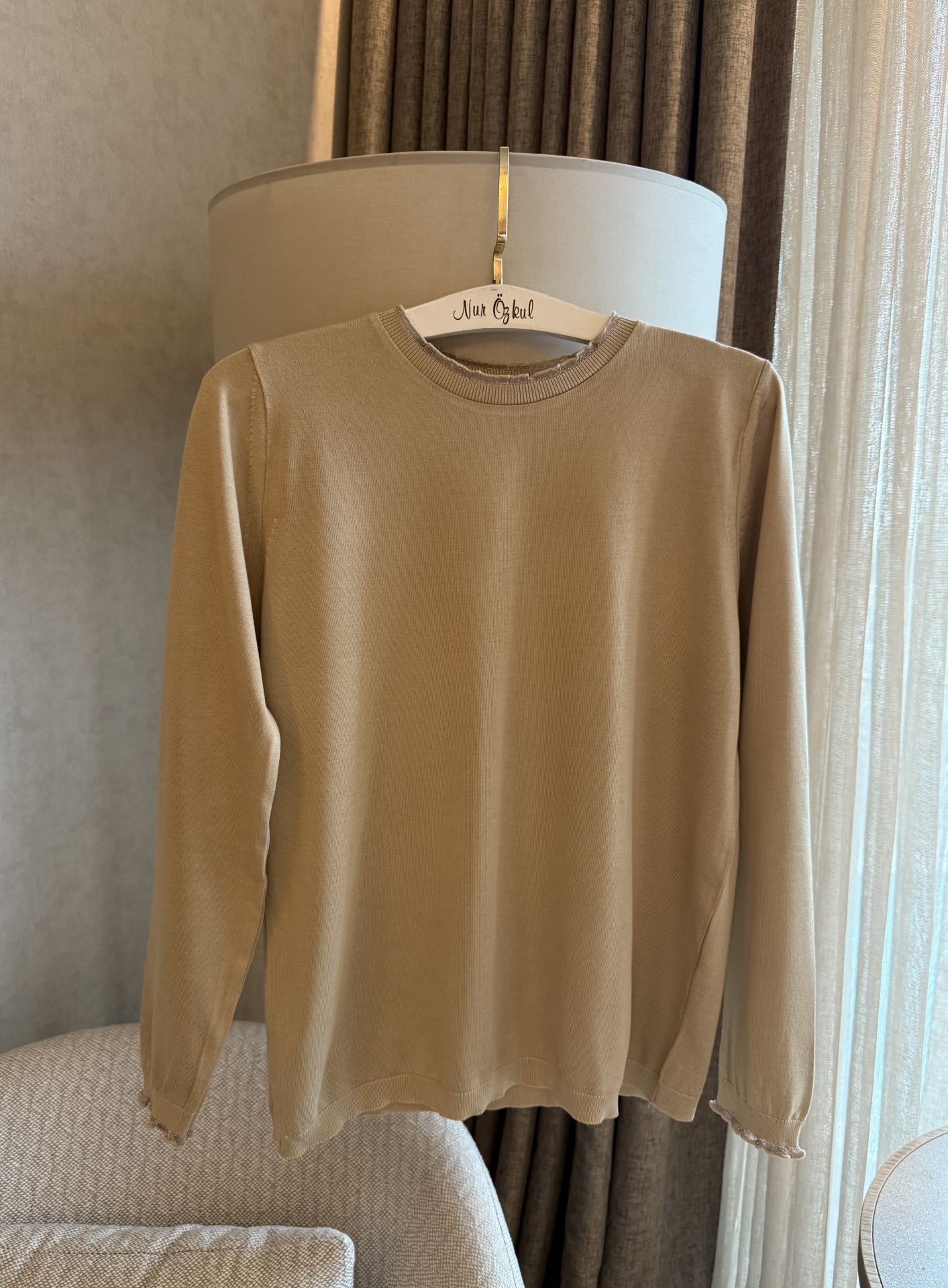 Kol ve Boyun Detaylı Kazak (Sütlü Kahve)