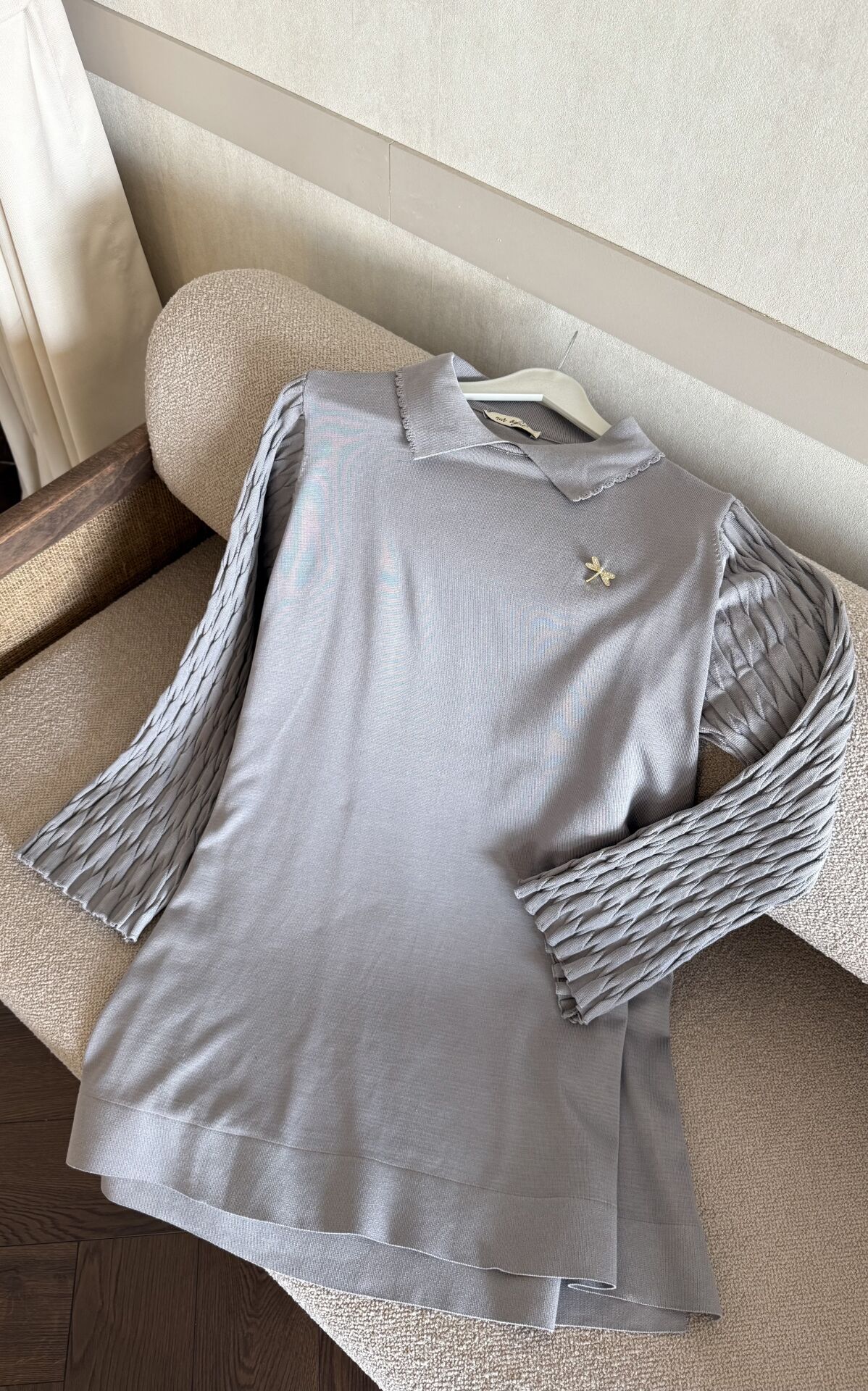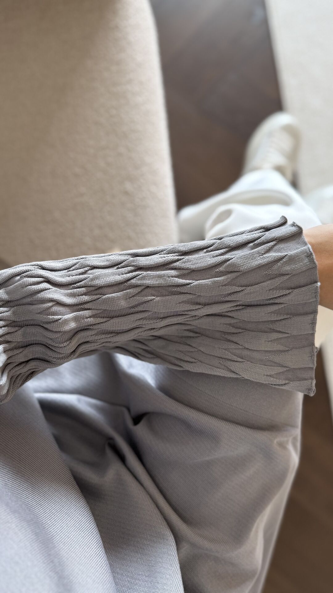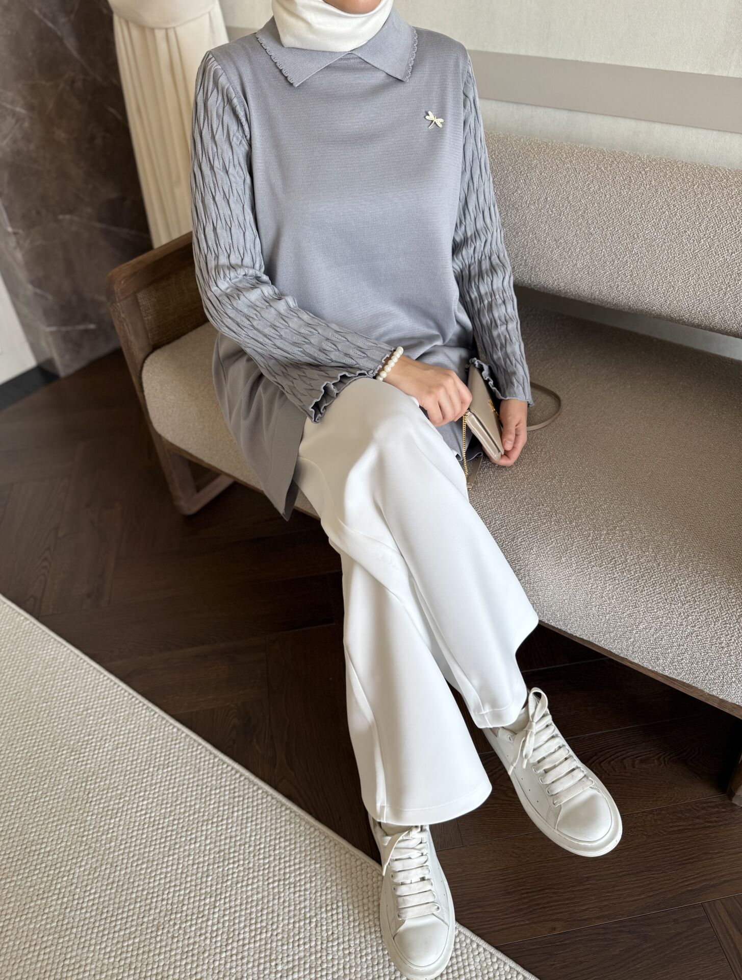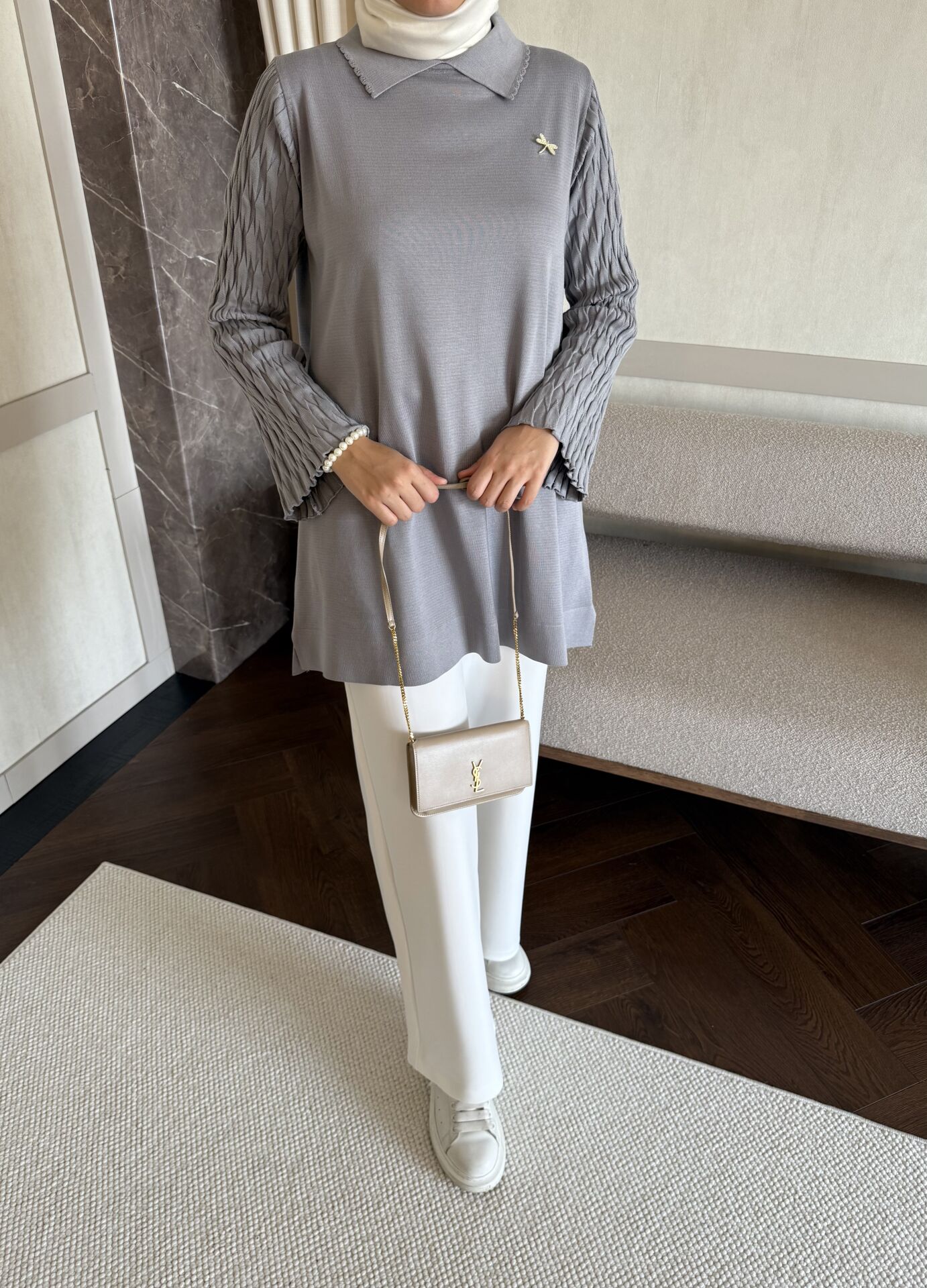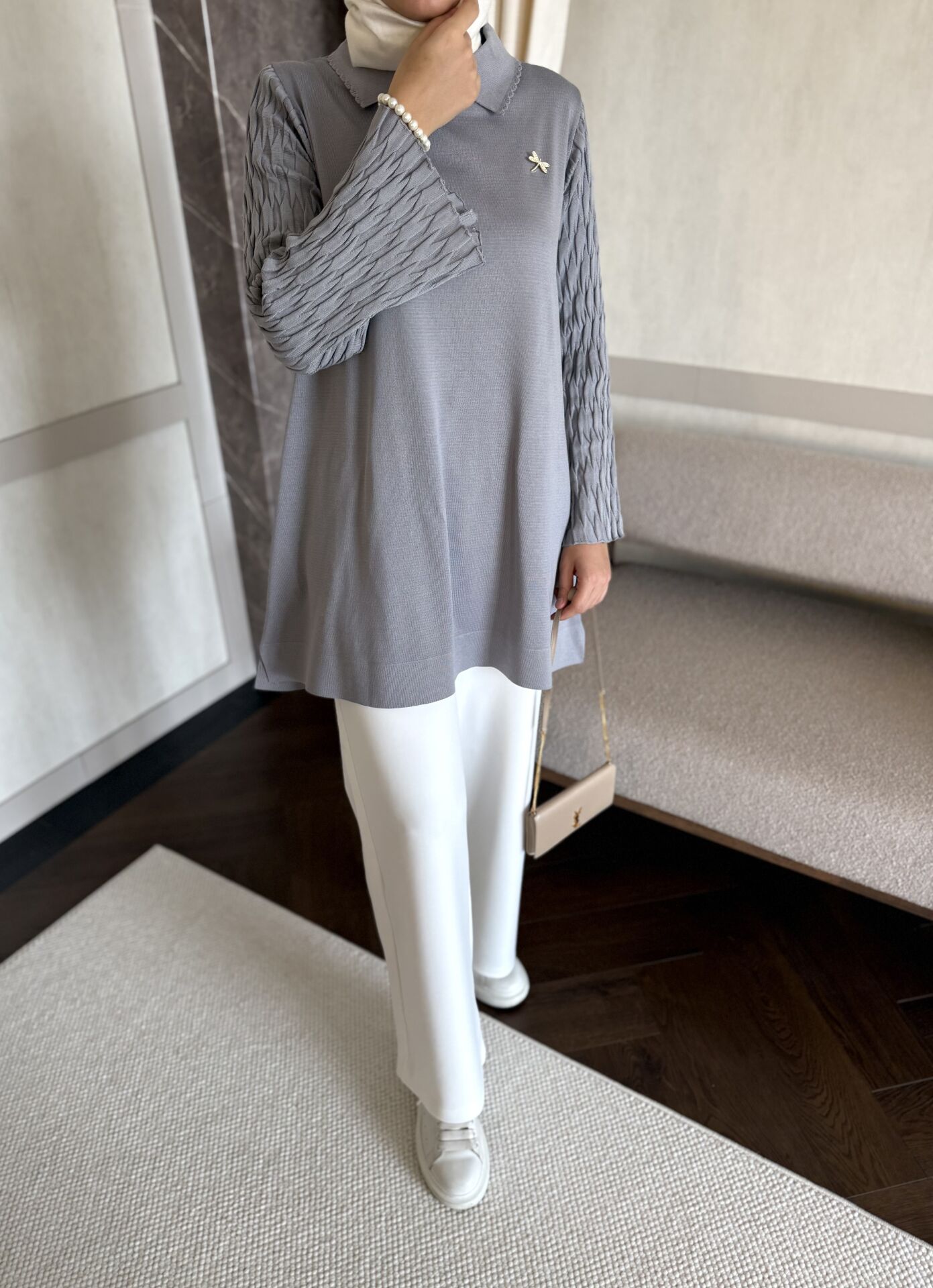 Kolları Desenli Yakalı Merserize Tunik (Gri)