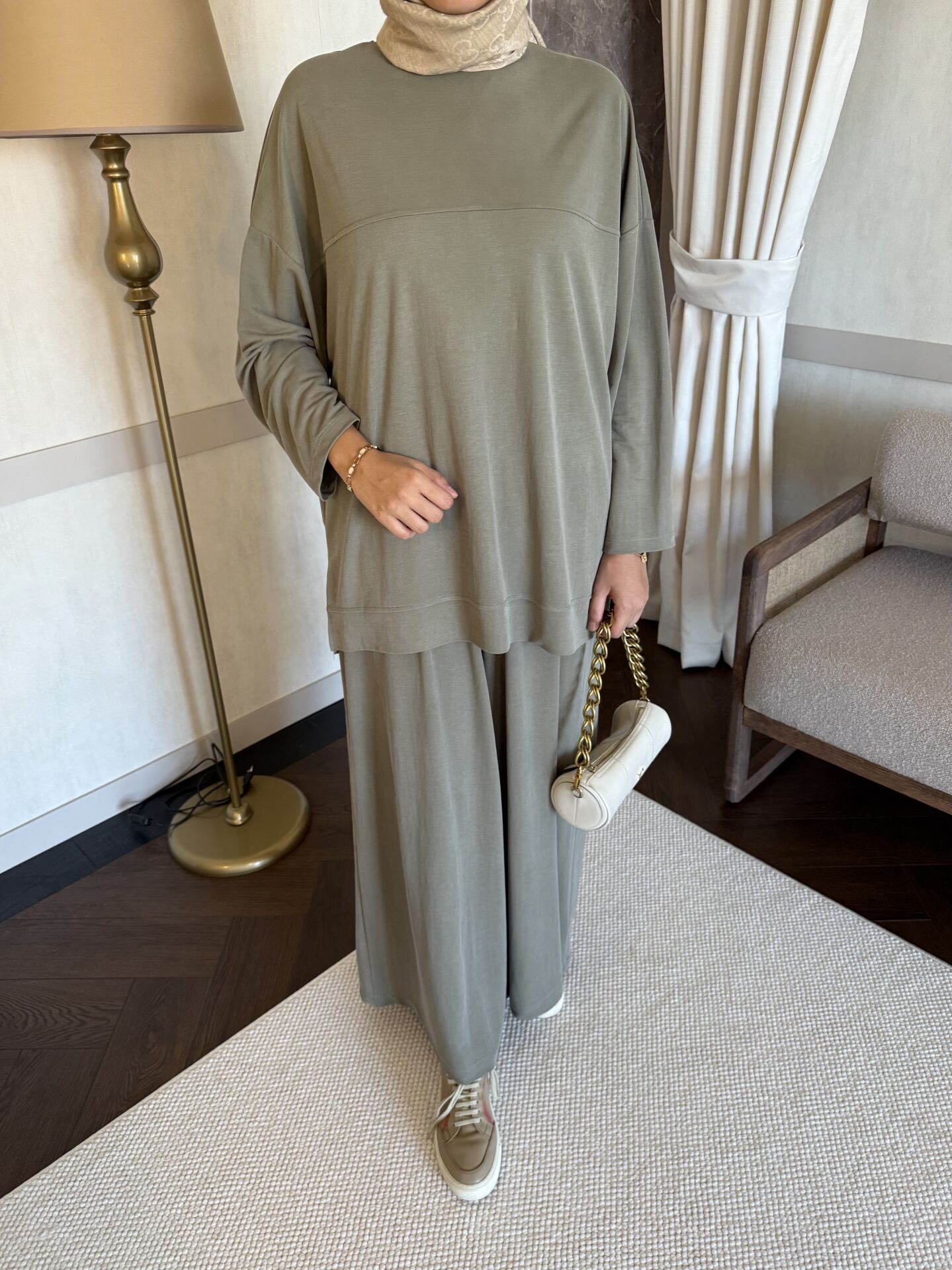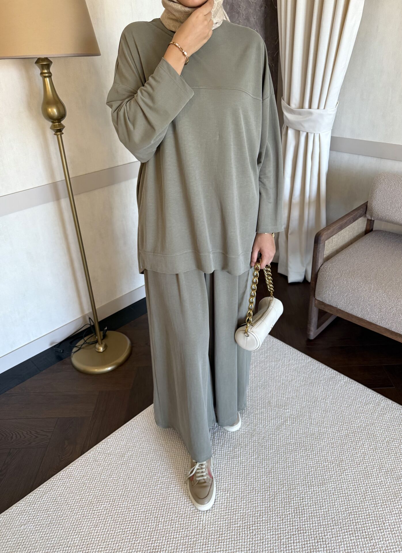 Pantolon 103 cm uzunluğunda, beli lastikli, iplidir