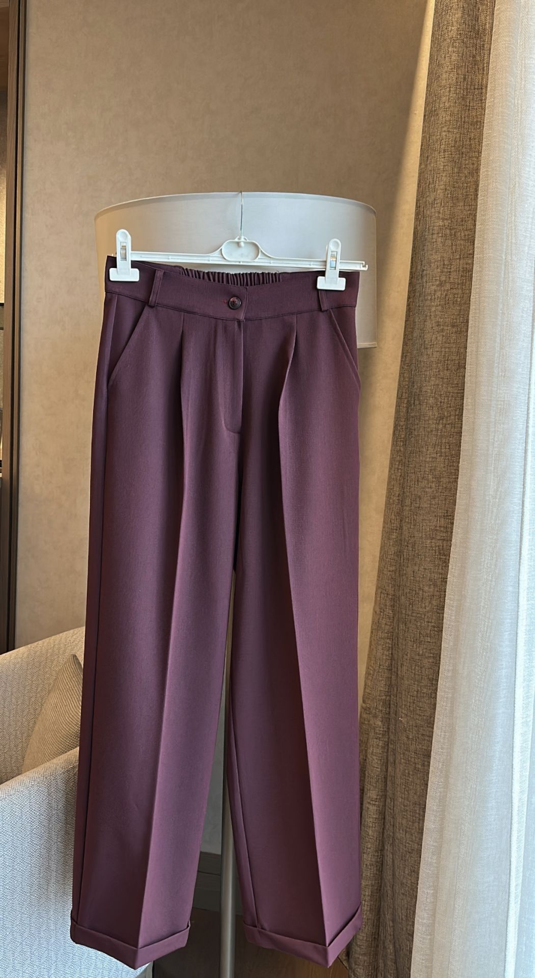 Pantolon ön kısmı düz fermuarlı ve düğmeli, arkası lastikli ve 101 cm'dir