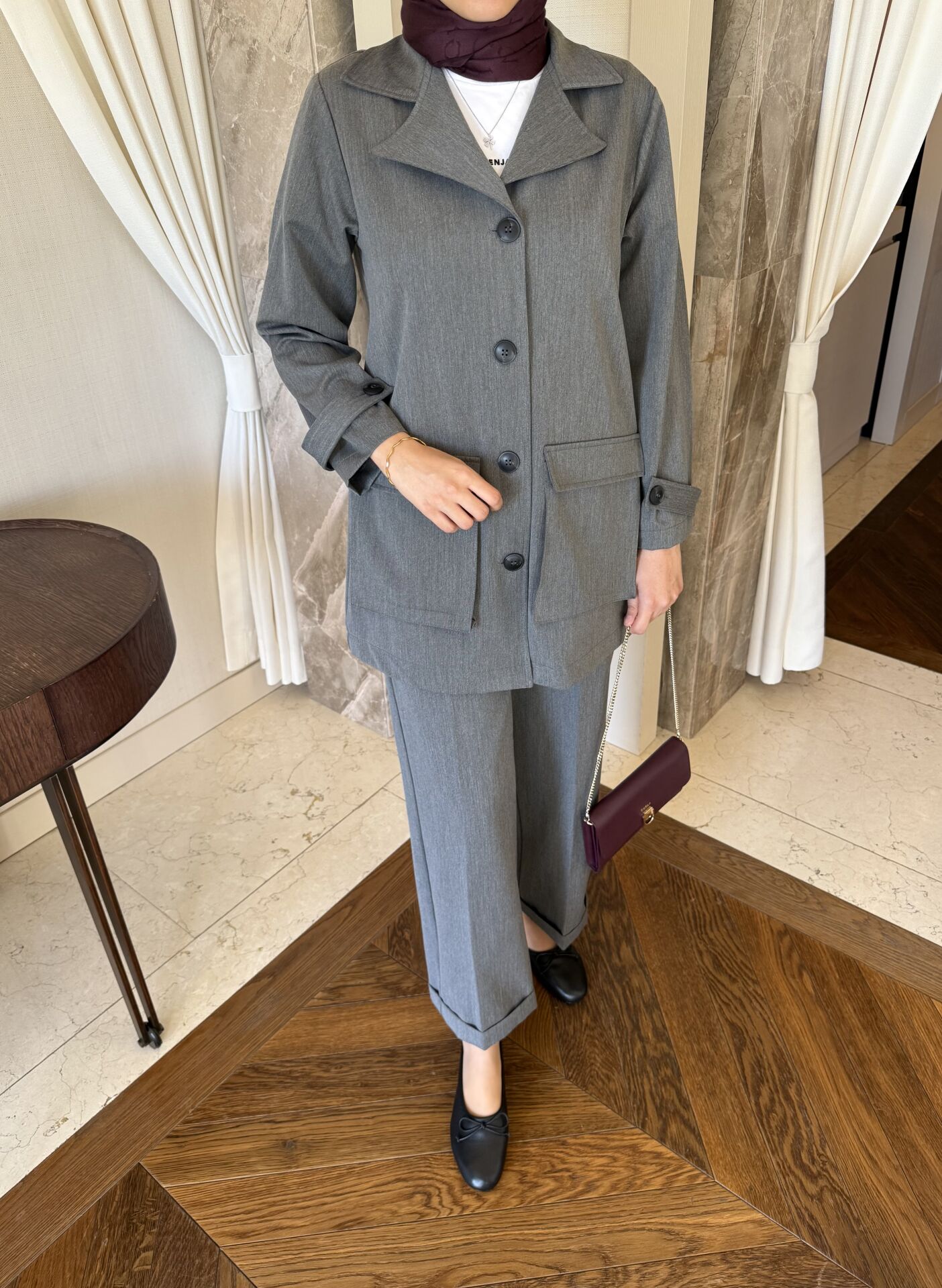 Pantolon ön kısmı düz fermuarlı ve düğmeli, arkası lastikli ve 101 cm'dir