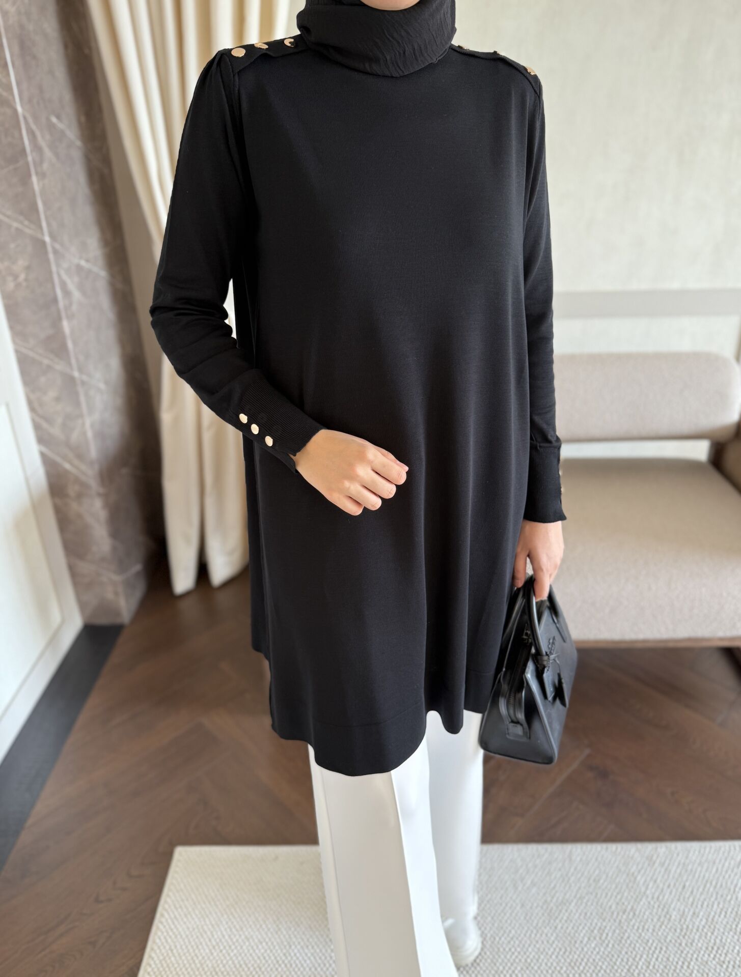 Omzu Patlı Merserize Tunik (Siyah)