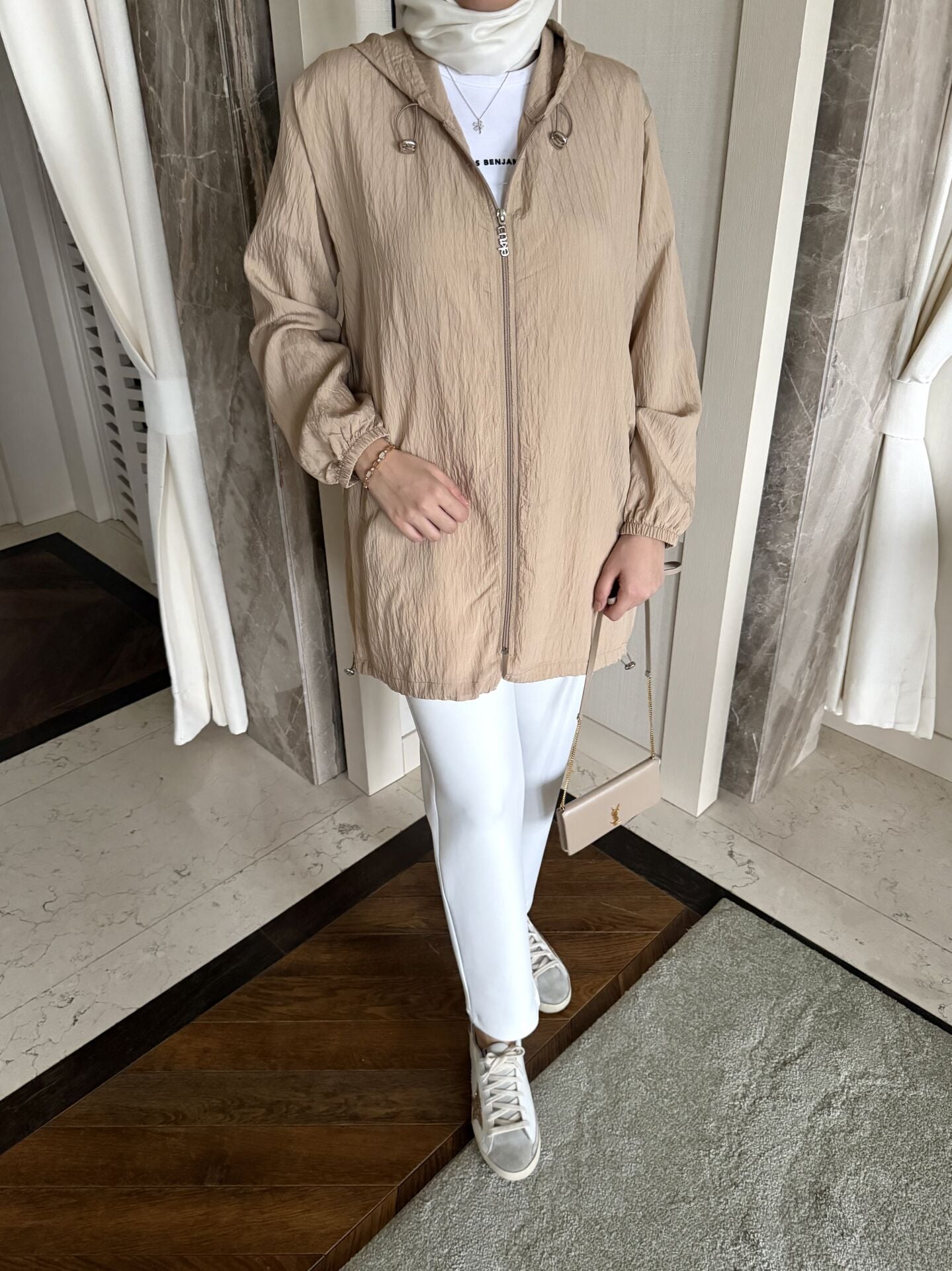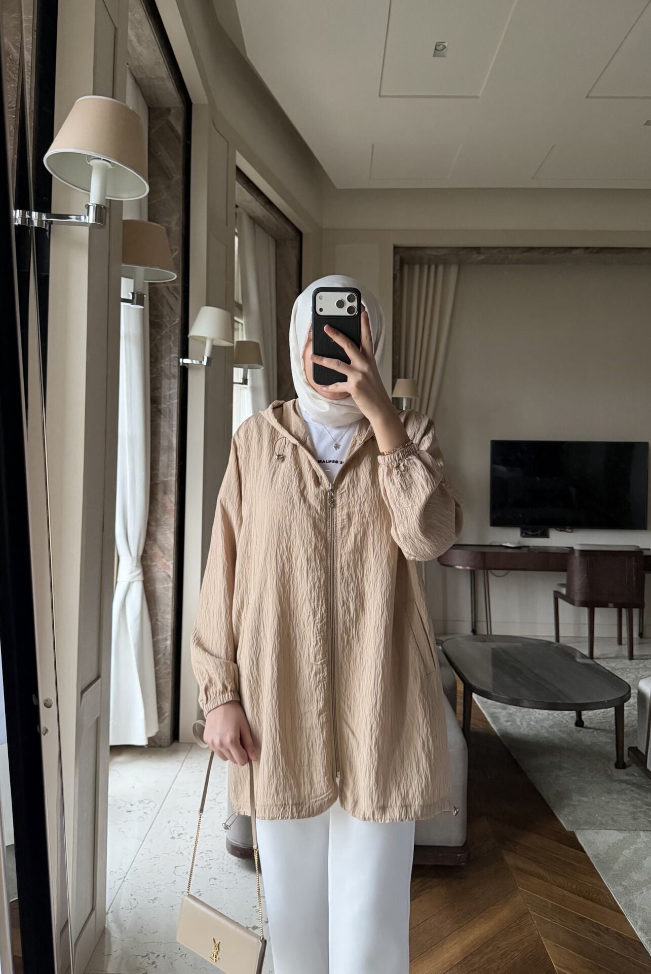 Önden fermuarlı, yanları ayarlanabilir büzgülü